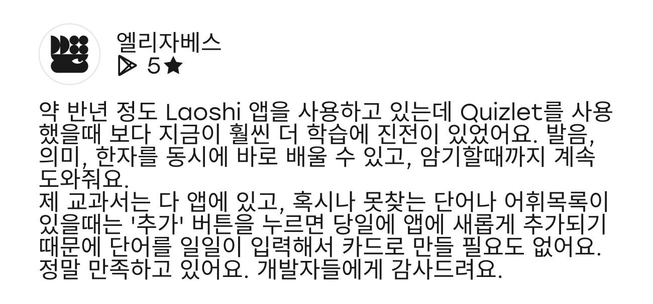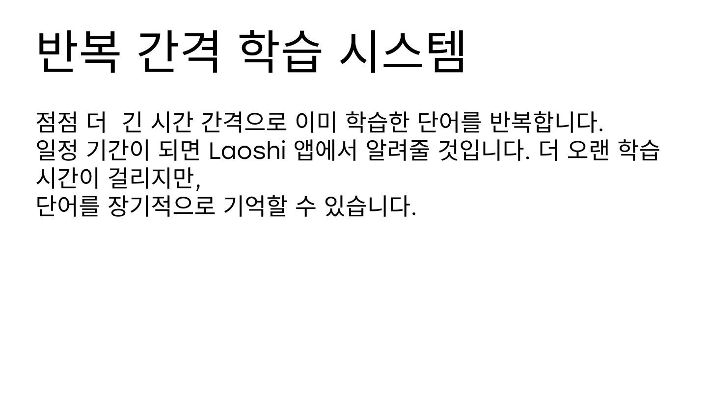 우리의 목표는 새로운 단어 및 한자 학습에 도움을 주는 것입니다. 학생들에게 Laoshi를 추천하고 함께 공유할 어휘 목록을 만들어보세요. 학생들이 새로운 단어를 편하게 암기하고 중국어를 훨씬 쉽게 배울 수 있습니다.